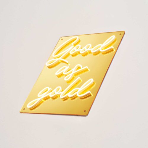 Good as gold neon sign is available in white neon with a premium gold finished backboard. This sign is an amazing addition to any room. Stand out with this luxurious neon sign.